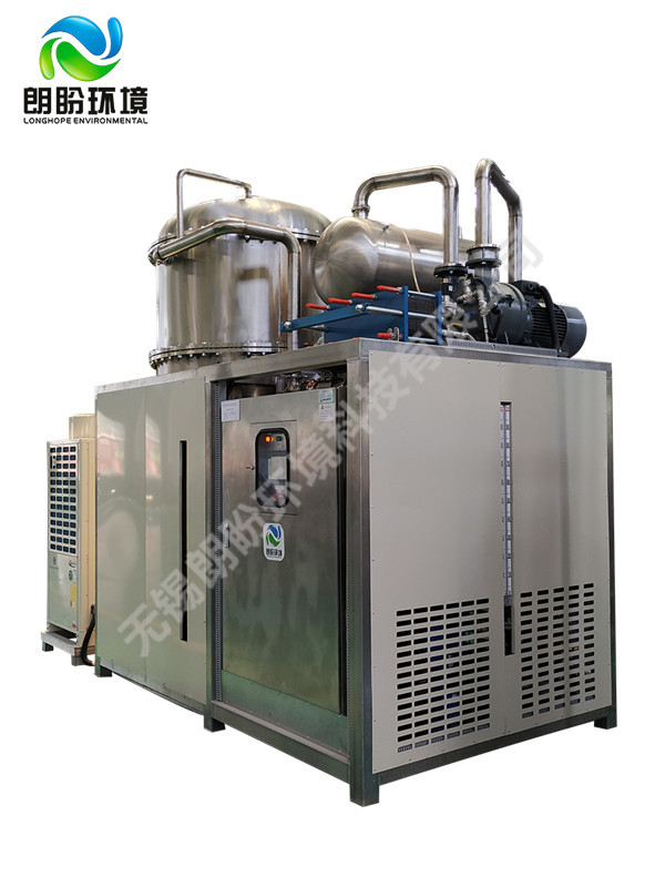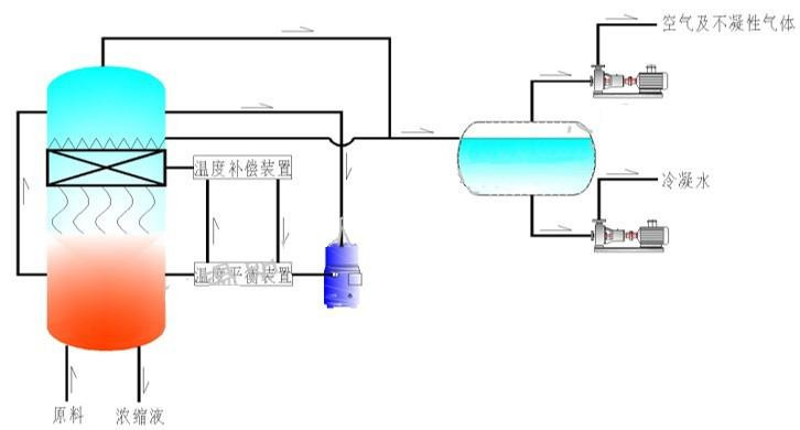 低溫蒸發(fā)結(jié)晶器的原理是物料的沸點(diǎn)隨著壓強(qiáng)的降低而降低。低溫節(jié)能濃縮設(shè)備整體保持真空狀態(tài),蒸發(fā)室的真空度約為95%~97%,在此壓強(qiáng)下水的沸點(diǎn)為35℃~37℃,系統(tǒng)無(wú)需配備進(jìn)料泵,利用蒸發(fā)室的負(fù)壓將物料吸進(jìn)蒸發(fā)室,通過(guò)強(qiáng)制循環(huán)方式將物料循環(huán)霧化,傳輸至換熱器上,物料中水分被蒸發(fā),物料連續(xù)循環(huán)霧化,通過(guò)蒸發(fā)室液位自動(dòng)補(bǔ)料,濃度達(dá)到要求后作為濃縮液排出設(shè)備。濃縮液一般粘度較大,需采用泵抽出。